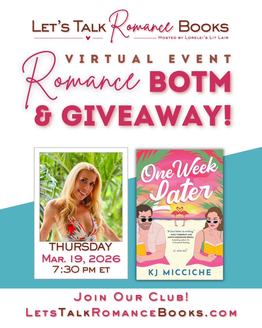 Meet & Greet contemporary romance author, K.J. Micciche, author of ONE WEEK LATER on March 19 at 7:30 pm ET!