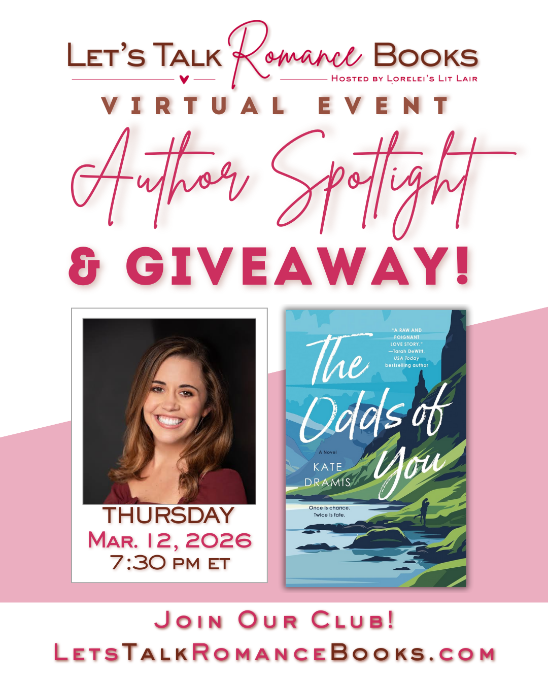Meet & Greet contemporary romance author, Kate Dramis, author of THE ODDS OF YOU on March 12 at 7:30 pm ET!
